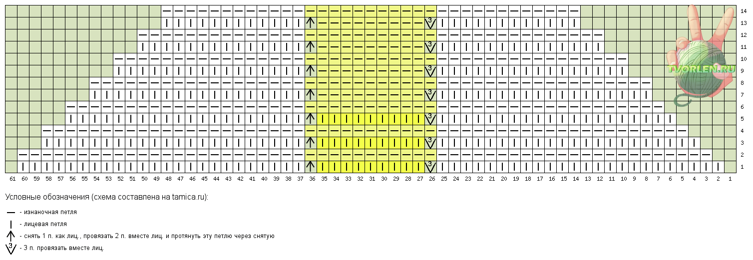 6 ряд – кром., 2 лиц, накид, 19 лиц., накид, 5 лиц., накид, 19 лиц.накид, 2 лиц., кром.